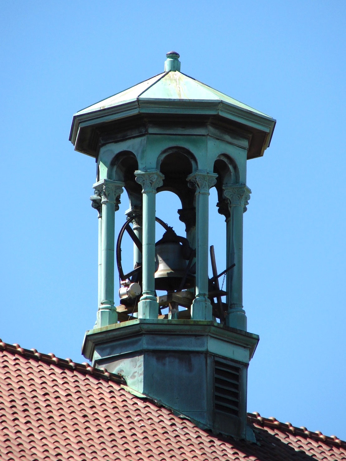St. Benedict the Moor is one of the smallest of the city’s Romanesque Revival churches, approximately 50 feet wide by a bit more than 100 feet in length, with seating for about 400 worshippers originally. Instead of a bell tower, a small cupola on the roof houses the bell. As at some of the other smaller Catholic churches, the full width of the worship space is spanned by a vaulted ceiling, with no interior columns.