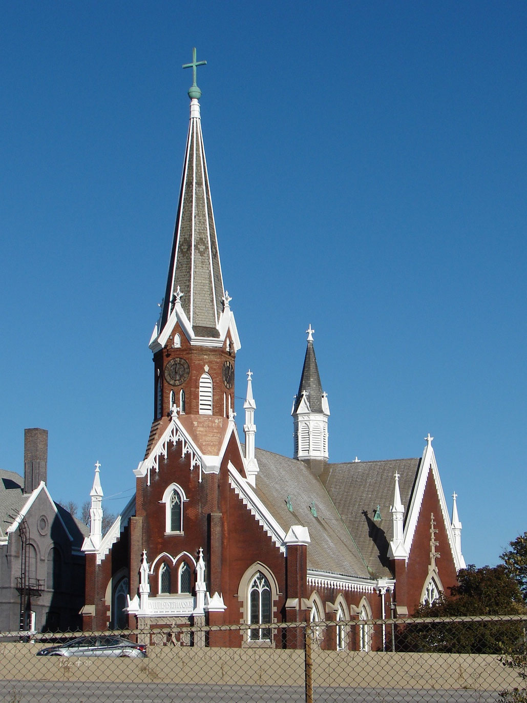 The exterior of the church is extensively ornamented with carved limestone and pressed metal. Limestone is used for door and window surrounds, buttress caps, and the two pilasters flanking the main entrance. Metal ornament graces the tops of the walls of the façade gable and transept gables, along the eaves on the side walls, and on the front gable of the tower where it transitions from square to octagonal. The metal ornament is a different design in each of these three locations. On many other churches, these areas are corbeled arcades of brick and are therefore the same color as the walls, while at St. Stephen’s the white painted metal stands out clearly against the dark red brick. There are also tall pinnacles of metal atop the end buttresses of the façade and transept walls, two slightly taller pinnacles at the rear corners of the tower, and two slightly shorter pinnacles atop the limestone piers flanking the main entrance.