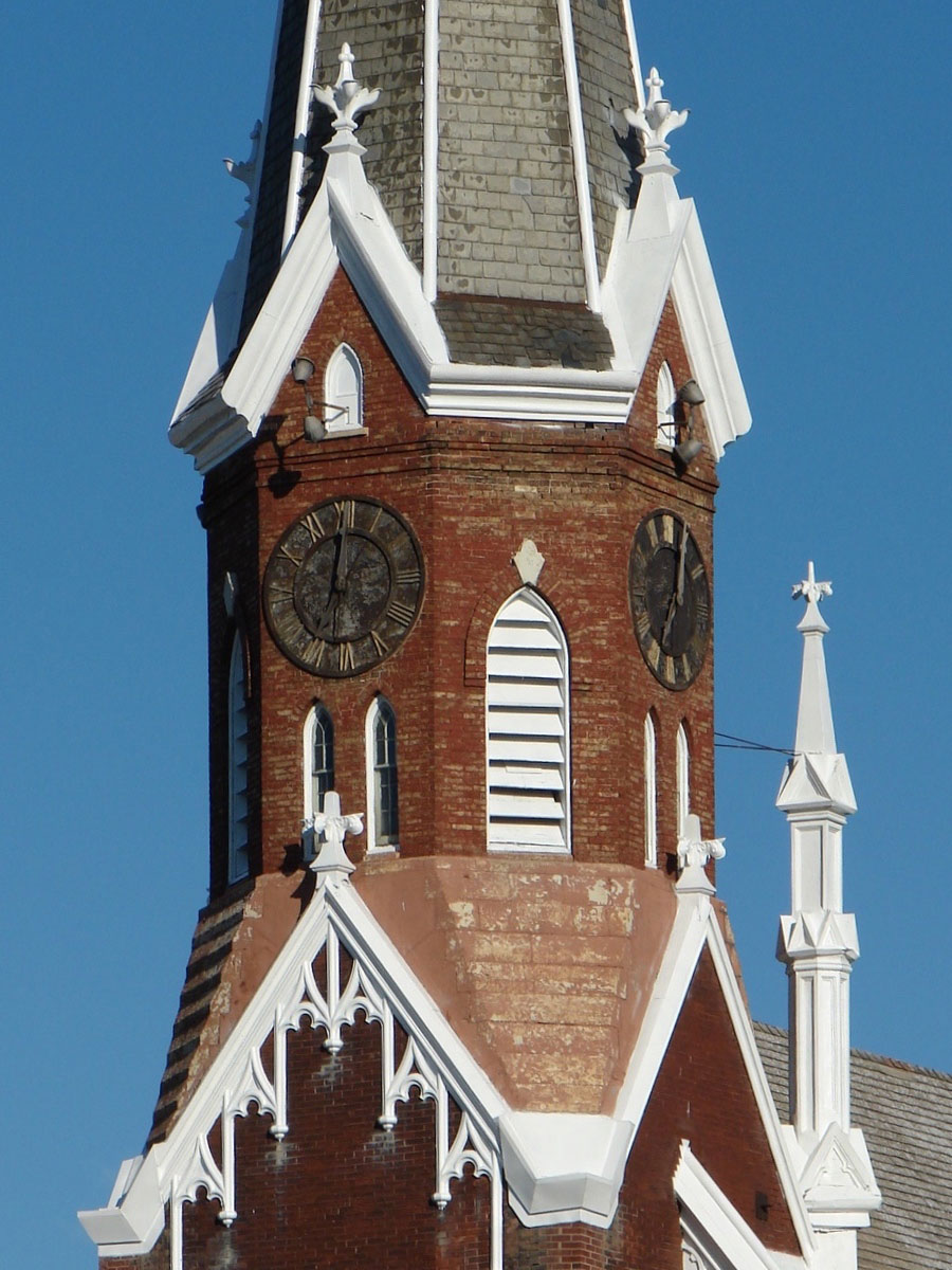 St. Stephen’s was organized in 1854 as a daughter of Trinity Lutheran. It was the fourth German-speaking Lutheran congregation established in Milwaukee and the first on the South Side. The congregation built a church on the present site in 1866, adding a tower and steeple to the building in 1879. Construction of the present church began in 1901 and was completed in 1902. However, the earlier church was not demolished in its entirety. Instead, the tower and steeple were retained and incorporated into the present church. The lower portion of the tower was resurfaced in the same dark red brick as the rest of the church, while the octagonal upper portion, constructed of Cream City brick, was simply painted a matching shade of red. Some of the original yellow color of the brick can be seen where the paint has worn away. The four clock faces are also original to the 1879 construction of the tower.