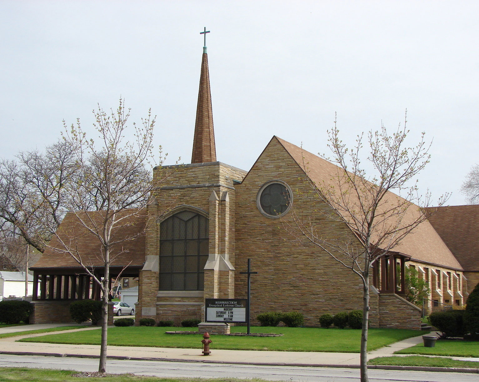 Resurrection Lutheran was founded in the second decade of the twentieth century in what was then the Town of Lake. Services were initially held at the Lake Township Hall at Howell and Howard Avenues, just west of the present church where the Tippecanoe branch of the Milwaukee Public Library is now located. Like most of the Milwaukee area’s other Lutheran churches dating to this period and earlier, the founding members were primarily German immigrants and their descendants, and services were originally conducted in German. The congregation soon built a small wooden church on the current property, which served until its replacement by the present church in 1954. The property was annexed to the City of Milwaukee in 1929.