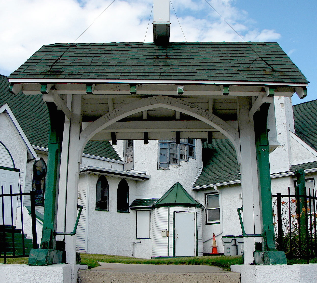 The mission added a guild hall in 1915, in a new wing perpendicular to the church wing, thus giving the building its present “L” shape. The new wing provided an assembly room on the main floor and recreational facilities in the basement, including a bowling alley and billiard room. Milwaukee architect Walter Memmler designed the addition, along with some alterations to the older building. Memmler’s design visually unified the two wings by covering both in stucco, removing some of the Gothic Revival details from the church, and adding the round entrance and stair tower at the inner hinge point of the two wings.